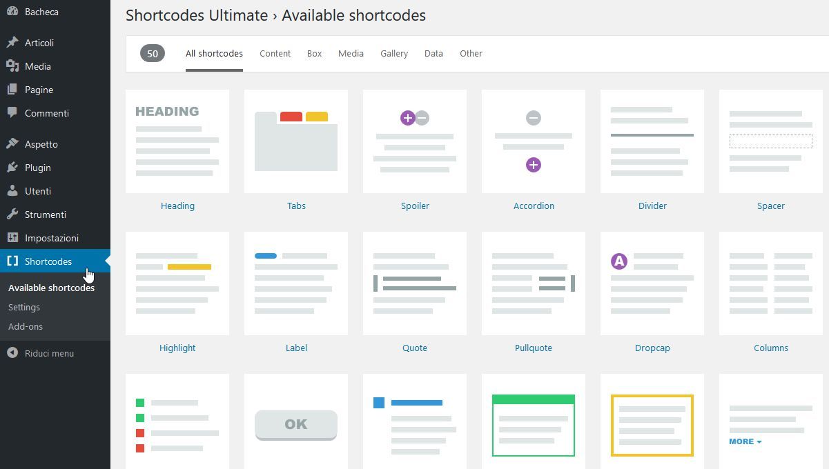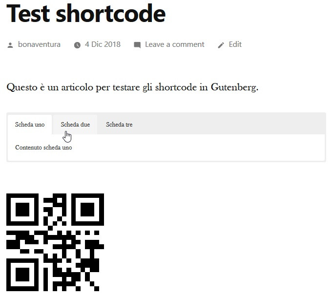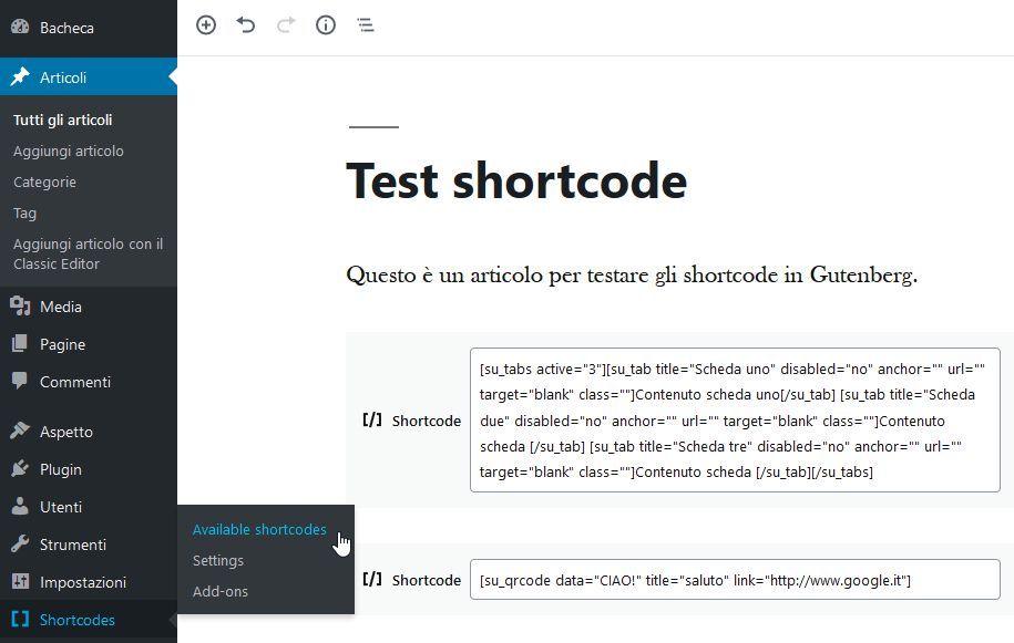 Anche se gli shortcode possono sembrare uno strumento meno ‘moderno’ messi a confronto con i builder o con il nuovo editor a blocchi Gutenberg, possono tornare ancora molto utili e pratici anche perché lo stesso Gutenberg contiene un blocco ad essi dedicato. Ecco di seguito il link al plugin e un’immagine di alcuni degli elementi disponibili, seguita da due immagini di un test eseguito proprio con il blocco shortcode di Gutenberg.