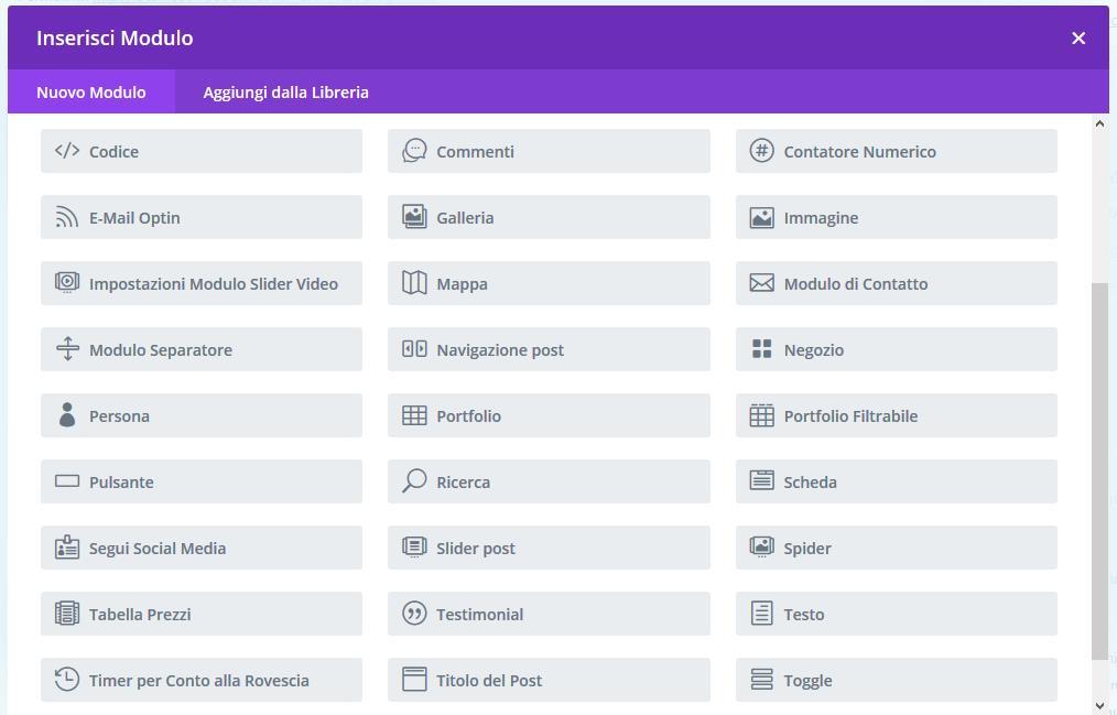 Divi può essere utilizzato sia insieme al tema omonimo, sia installando plugin quando è già attivo un altro tema, e in entrambi i casi si presenta con una modalità di composizione backend, a blocchi (vedi foto), e una frontend, dove si lavora direttamente sull’anteprima della pagina. Nelle versioni più recenti, inoltre, entrambe le modalità di lavoro sono state velocizzate e rese più comode e pratiche, oltre che più ricche di funzionalità. Come per la maggior parte dei builder, anche Divi offre una serie di ‘sezioni’ con varie suddivisioni in colonne, una ricca collezione di elementi (in questo caso chiamati ‘moduli’ (vedi foto seguente) e ovviamente anche vari template preconfezionati che possiamo poi personalizzare secondo le nostre esigenze.