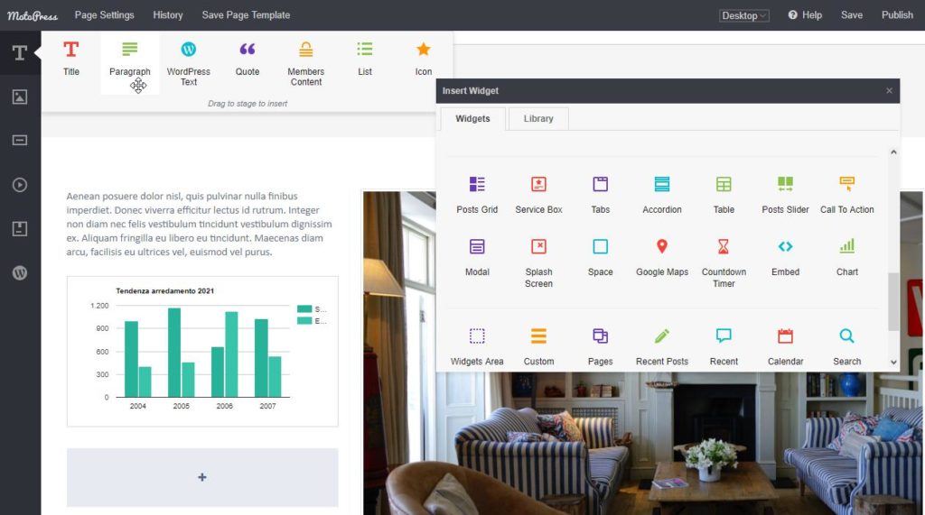 Una sessione di composizione con MotoPress Content Editor, si notino i pannelli degli elementi, fra cui il grafico utilizzato appunto nella pagina.