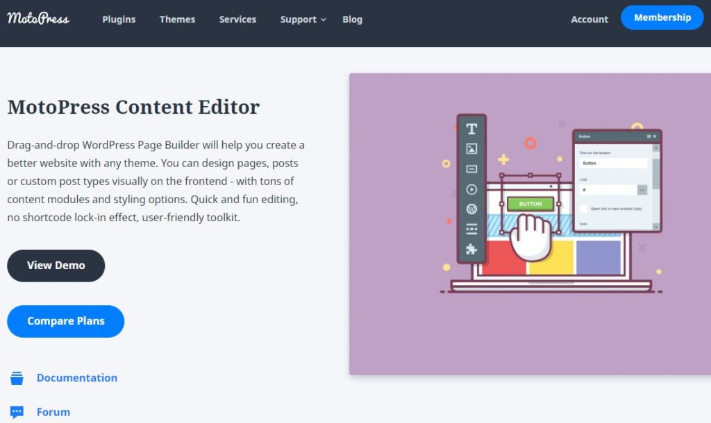 La pagina del plugin MotoPress Content Editor sul sito ufficiale, si noti il pulsante per attivare la demo e provarlo gratuitamente online.