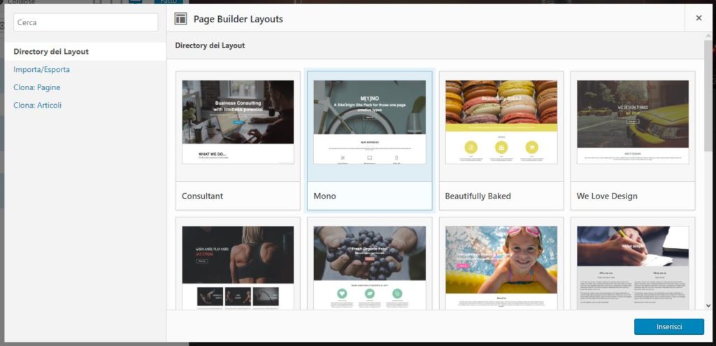 I widget già presenti di serie nell’installazione, infatti, vanno almeno abbinati alla raccolta ufficiale di SiteOrigin (SiteOrigin Widgets Bundle), che permetterà infatti anche di utilizzare al meglio l’editor ‘live’, ovvero con anteprima in tempo reale. Questi widget extra sono inoltre fondamentali per utilizzare appieno i modelli (layout) che il plugin mette a disposizione da subito (vedi foto seguente).