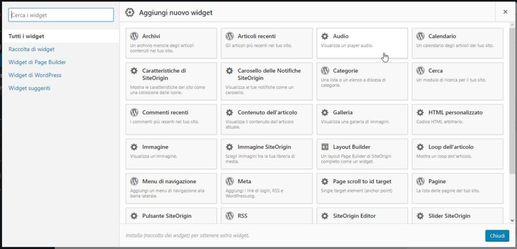 Anche PageBuilder, come diversi altri theme builder già presentati sul blog, è disponibile, nella sua versione limitata (lite), fra i plugin gratuiti ‘ufficiali’ di WordPress, ma si distingue dai suoi concorrenti per l’approccio basato sui widget piuttosto che su elementi di impaginazione proprietari (vedi foto seguente). Ciò si traduce da una parte in un codice più standardizzato e ottimizzato, dall’altra nella possibilità di arricchire la libreria di elementi utilizzabili con i widget sviluppati da terze parti.
