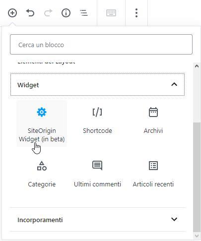 Se, invece, utilizziamo il nuovo editor a blocchi Gutenberg (vedi foto) potremo servirci dei due blocchi che richiamano, rispettivamente, il builder completo o un singolo widget.