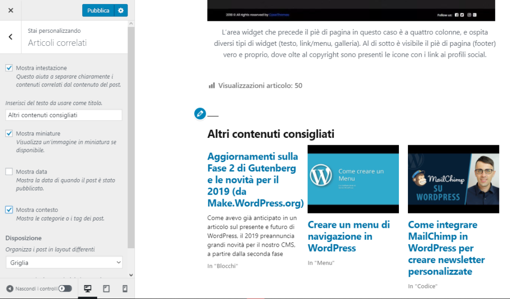 • possibilità di visualizzazione alternativa, ovvero di posizionare le anteprime degli articoli correlati in altre aree della pagina (per es. come widget o in mezzo al testo, ovvero ‘inline’)